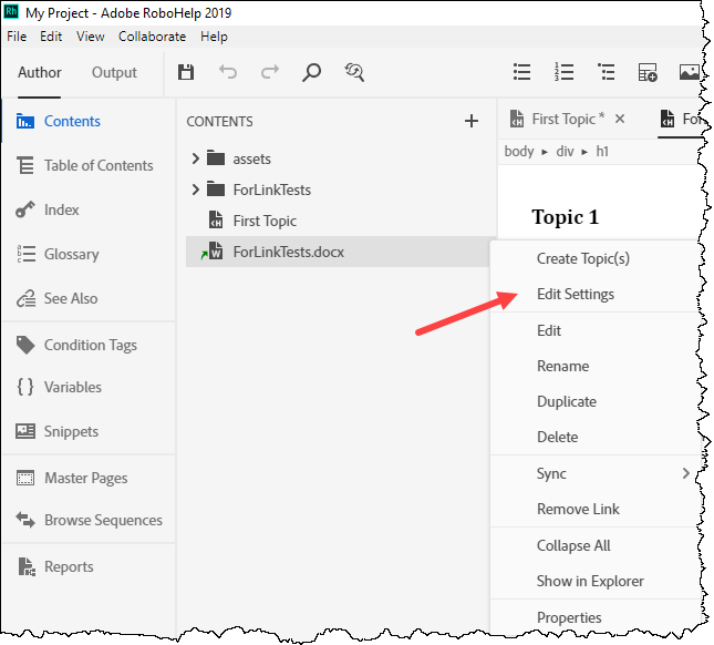 When the DOCX file is displayed in the Contents Panel, hover over it and select Create Topic(s) in the Options menu and your topic(s) will be created. The settings for the linked document will be whatever is defined in the default wsf file selected in Project Settings.