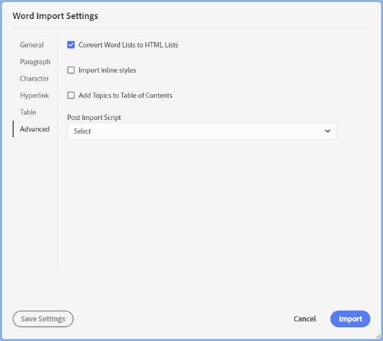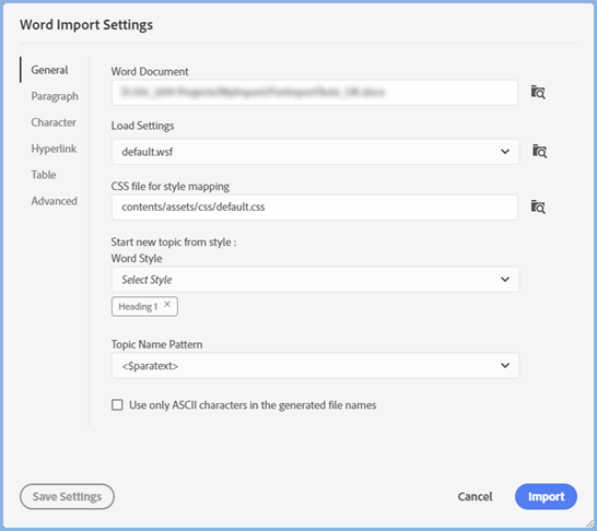 Initially use the default.wsf (Word Settings File) and browse to the document to be imported. As soon as you have selected the document, in the bottom right corner of the window you will see Adobe RoboHelp reads the document after which you can proceed with the other settings.