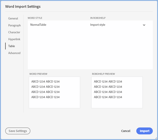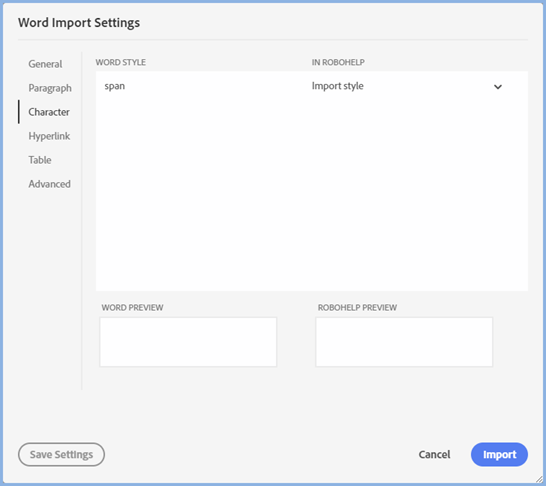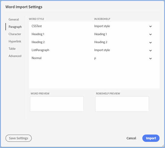Adobe RoboHelp 2019 attempts to automap styles where it can match the name in the Word document with a style in the CSS defined for style mapping. Against each style in Character, Paragraph and Table settings you will see how the styles have been mapped.