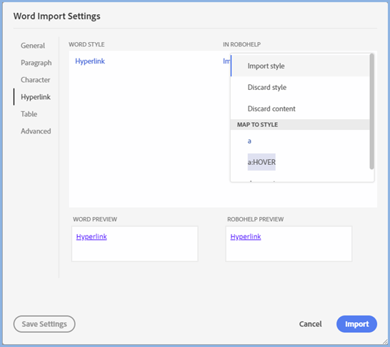Hyperlinks can be imported or mapped to an existing hyperlink style in your CSS.