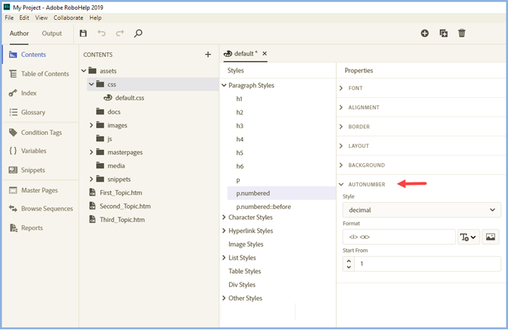 Autonumbering applies a number to each instance of a particular style in a topic. This can be a heading style or a paragraph style
