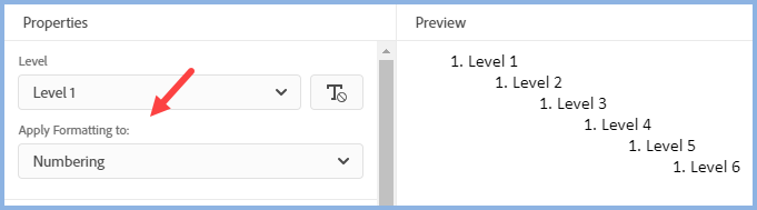 The Apply Formatting To dropdown controls whether your changes apply to the Numbering / Bullets or the Content. Make sure the required option is selected.