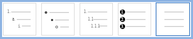 The standard toolbar has three list options, unordered lists (bullets), ordered lists (single level numbering) and multilevel lists.