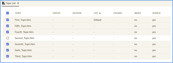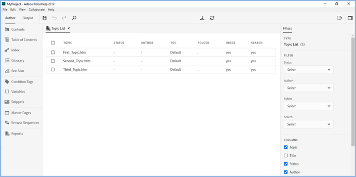 All the topics are shown and to the right are the options for filtering the files shown and the columns for those files.