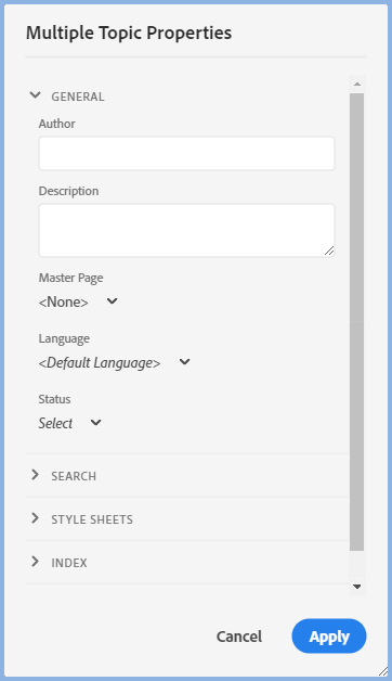 To change the topics of multiple topics, right click and select Properties. The dialog below will be displayed allowing you to change the properties of the selected topics.