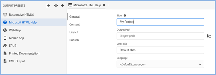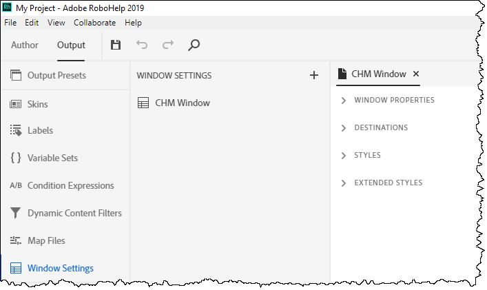 To create or edit the window for Microsoft HTML Help (CHMs), click Outputs and select Window Settings.