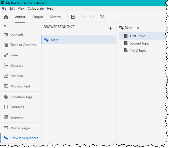 If some of your outputs only include some of the topics in the browse sequence, Adobe RoboHelp will automatically exclude the topics not in the output.