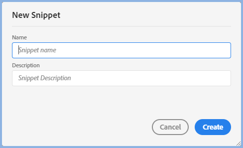 - Set the fields as required and click Create to open a blank Snippet in the Design Editor.