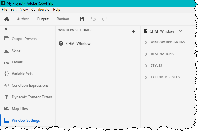 To create or edit the window for Microsoft HTML Help (CHMs), click Outputs and select Window Settings.