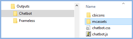 - When the frameless output has been generated, use File Explorer and go to the chatbot output folder. Copy the mcassets folder.